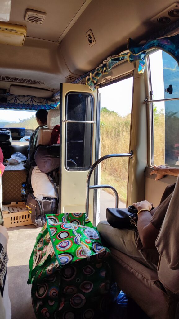 Nous partons en mini bus. Nous sommes les seuls touristes à part un autre couple d’étrangers. La climatisation naturelle du bus consiste à laisser la porte ouverte pendant le trajet. C’est pratique ça offre une fenêtre supplémentaire pour la vue.