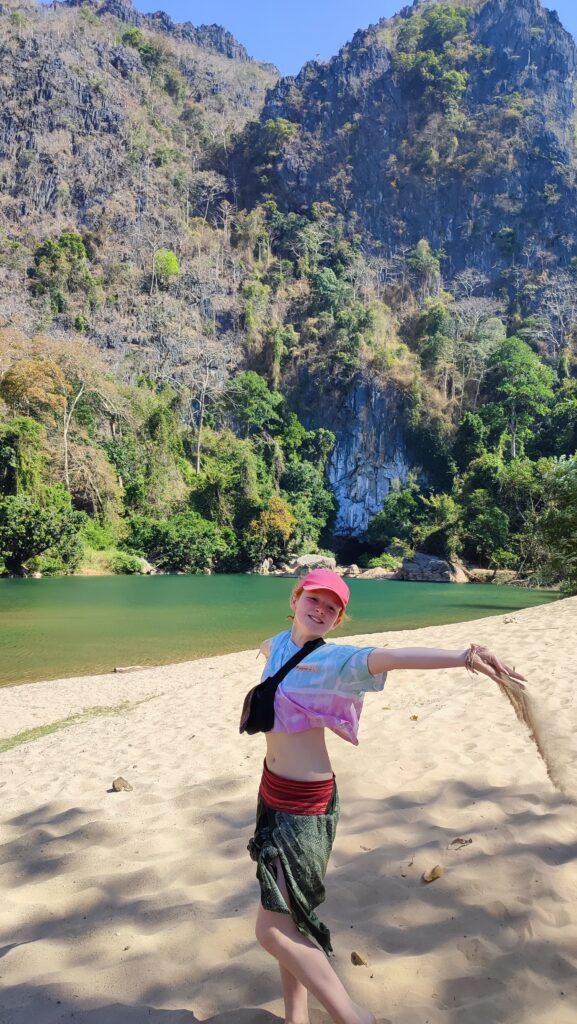 Le guide est très prévenant avec nous pour les descentes et les montées dans la pirogue. Il fait bien attention aux enfants et nous laisse le temps de visiter les galeries à notre rythme. Grâce à lui, nous aurons l’un des arrêts rien que pour nous ayant choisi de nous le faire au retour plutôt qu’à l’aller où il y avait trop de monde. Ça méritera un pourboire pour se payer une bonne grande Lao Beer!