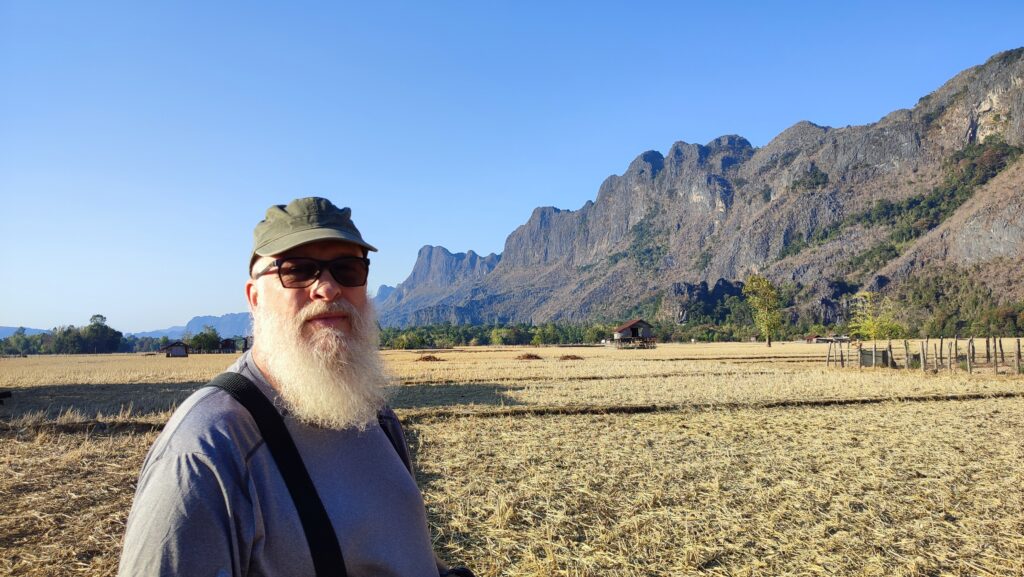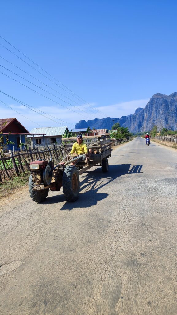 La route est asphaltée, donc confortable. Après la ligne droite de la route 13 qui longe le Mékong (construite par les chinois), nous bifurquons à l’Est dans les montagnes sur une route qui va jusqu’au Vietnam. Donc empruntée par bon nombre de gros camions. Puis virage au sud en direction du cul de sac de Kong Lor. La petite route entourée de champs cultivés et de montagnes Karstiques est magnifique. De nombreux villages dans lesquels habitent les paysans de ce coin agricole tranquille et authentique. Jolies petites maisons de bois sur pilotis, entre lesquelles slaloment des vaches, quelques chèvres, de nombreuses poules sous le regard alangui des chiens des villages qui se réchauffent allongés sur l’asphalte.