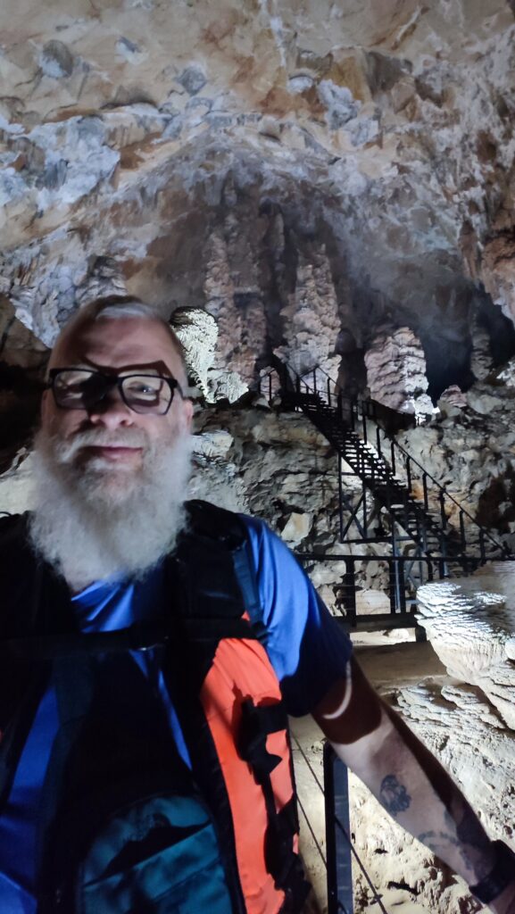 Lors de la traversée il y a deux escales à terre de prévu pour admirer les galeries, leurs formes et leurs hauteurs vertigineuses. Ces arrêts sont superbement bien balisés avec un éclairage sur détecteur de mouvement, des escaliers et des passerelles en métal très sécurisés. On s’en met plein les yeux. Il y a des endroits tellement hauts qu’on dirait des cathédrales de stalagmites.