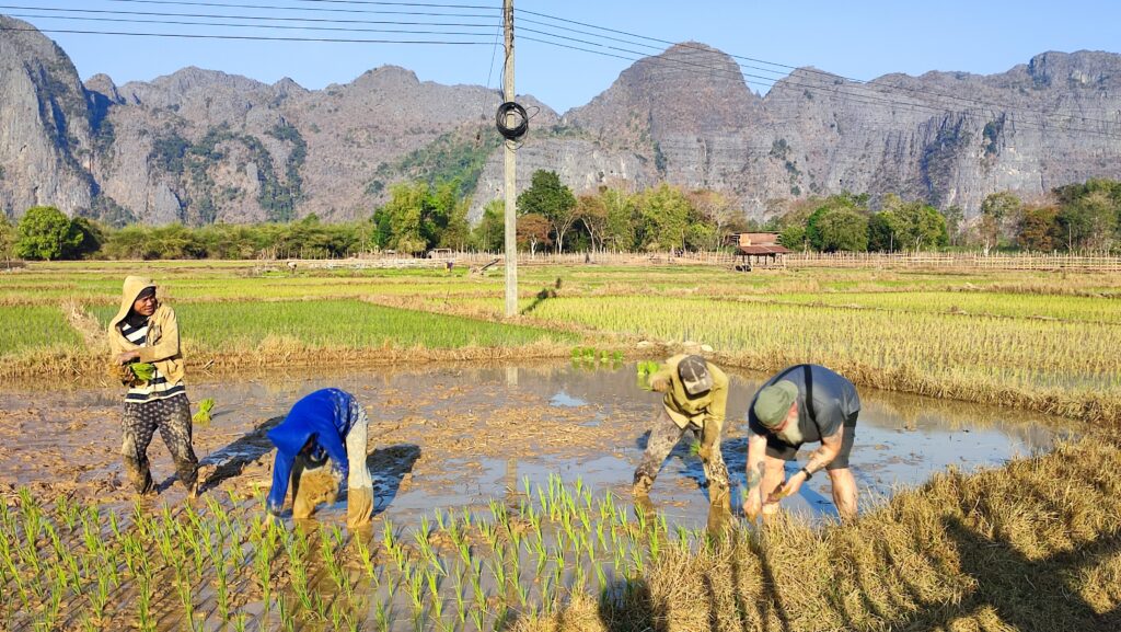 Cette fois nous faisons les arrêts photos que nous souhaitions. Nous aurons ainsi pu profiter des différentes luminosités de la journée car le soleil se lève d’un côté des montagnes et se couche de l’autre côté, la route descendant du nord au sud avec les montagnes de chaque bord. Nous stoppons sur le côté d’une rizière pleine d’eau, assez rare en cette saison sèche car la récolte a déjà eu lieu en novembre. Quatre paysans sèment avec rapidité leur semis de riz, bien en ligne. Nous leur demandons pour les prendre en photos et ils nous proposent de nous joindre à eux. Ils sont pieds nus dans 15 cm d’eau boueuse. Hugo se lance et les rejoint en retirant ses chaussures. Il nous dira par la suite que le bain de boue était très doux et très agréable pour les pieds. Le paysan qui le forme est patient et extrêmement souriant. Quand Hugo termine sa 2ieme botte de semis, son professeur sort du champ avec lui pour l’amener dans sa cour afin qu’il puisse se nettoyer les pieds pour remettre ses chaussures. Super sympa.