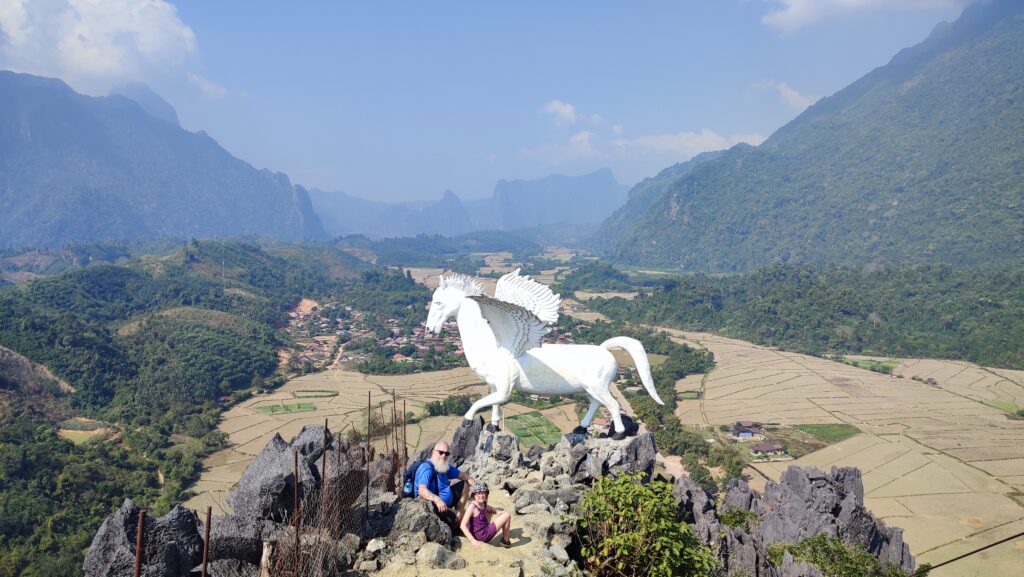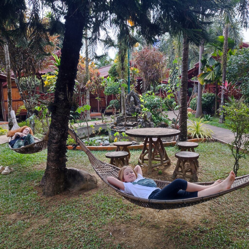 Vang Vieng sera notre plus longue escale depuis le début du voyage…. Alors oui, Vang Vieng est moche, ses rues sont jonchées de détritus, les plaques de béton qui recouvrent les égouts sont régulièrement brisées ce qui demande d’être concentré sur ses pieds à chaque promenade. Les odeurs de poubelles, d’égout, de brûlis et de brochettes au barbecue se mélangent matin et soir. Mais nous avons trouvé avec notre guest, un véritable havre de paix dans un écrin de verdure tropicale avec un couple d’hôtes au grand coeur, Moukda et Vanh, très attachants. Alors nous décidons de rester jusqu’au dimanche et de prendre notre temps.