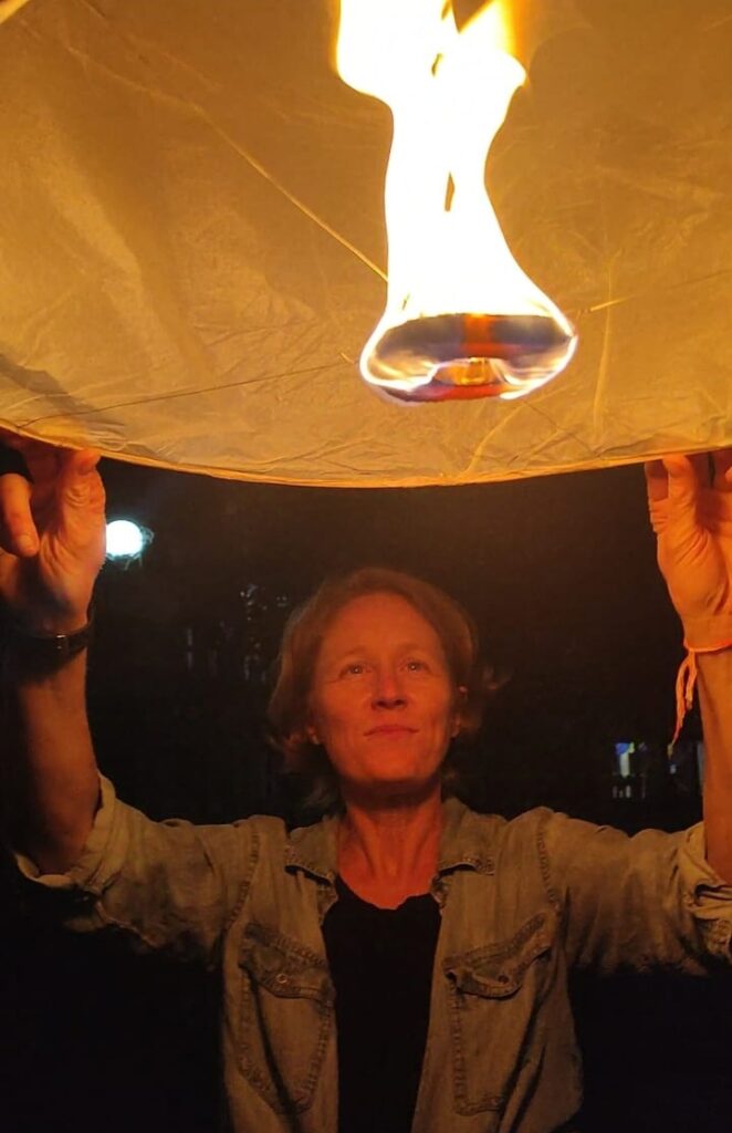 En rentrant à la guest, Moukda et Vanh nous accueillent et nous offrent deux lanternes lumineuses. L’une d’entre elle s’est déchirée au montage, mais Vanh la rafistole rapidement avec du scotch et nous les lançons ensemble dans le ciel en mélangeant nos voeux et en riant, constatant que la lanterne défectueuse monte encore plus vite que l’autre. C’est un moment magique et d’une grande simplicité.