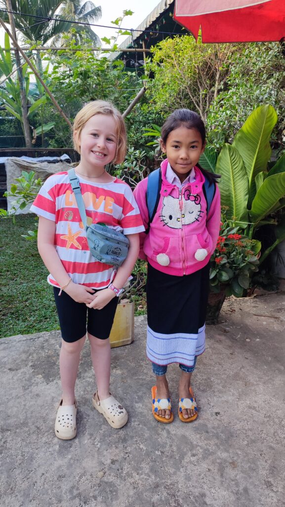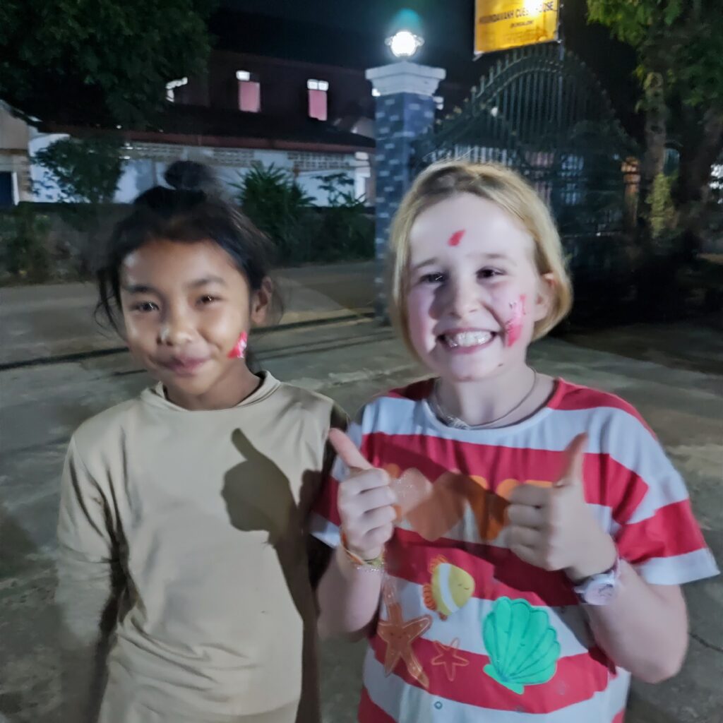 Le 1ier janvier au soir Moukda et Vanh ont organisé une soirée avec quelques uns de leurs amis. Nous nous y mêlons gaiement avec Bathilde. On se dandine sur les musiques Laos. Comme tout asiatique qui se respecte, les laotiens sont de grands adeptes du karaoké. Alors nous n’y échappons pas et tout le monde lève bien haut les bras sur la musique d’ « Alexandrie Alexandra » de Claude Francois 😂. Bathilde apprend quelques passes de rock à sa nouvelle amie « Pil » ( la fille adoptive de Moukda et Vanh). Elle danse aussi avec les adultes. Elle est de façon générale bien à l’aise avec les asiatiques qui l’adorent, la prennent en photo, lui font des bisous sur la joue, sur les bras. Elle vit super bien cette nouvelle popularité, et dit quotidiennement bonjour à absolument tous les enfants dans la rue et aux adultes les plus souriants. Bathilde: Asia Super Star 🤩.