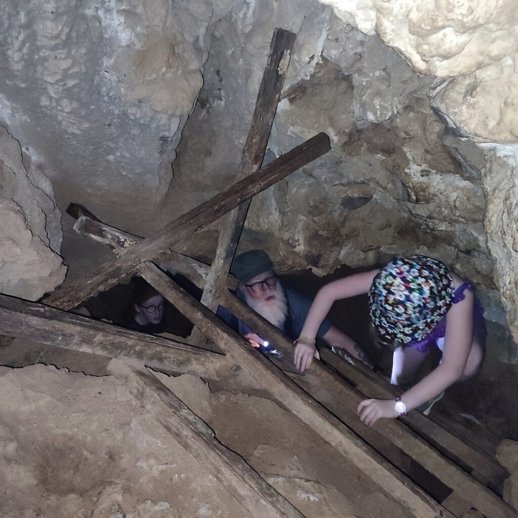 Nous nous faufilons également dans les entrailles de 2 grottes, dont le coin regorge. Hugo réussit à se glisser dans de véritables trous de souris, qui l’eut cru ?! ☺️ Nous progressons ensuite dans de plus « grandes galeries » au sol de glaise humide et glissant, slalomant entre stalagmites et stalactites sur lesquels Hugo aura laissé un peu d’épiderme en jurant Québécois ! Les concrétions calcaires prennent toutes sortent de formes: colonnes, volutes, tête du méchant Davy Jones 🐙 dans Pirates des Caraïbes…. Les grottes sont dans le noir complet donc il nous faut absolument nous éclairer à la lampe torche ou au téléphone.( Mais Pourquoi je n’ai pas amené nos frontales, POURQUOI???) Des échelles de bambous ou des rampes de fortunes sont parfois aménagées pour nous permettre de monter ou descendre. Ces cavernes sont de véritables labyrinthes dans lesquels il serait aisé de se perdre. On se donne les directions entre visiteurs en se croisant. Certaines d’entre elles ont servi d’abris aux vietnamiens et aux laos pendant les guerres. C’est toute une aventure de les parcourir, et même si l’on en ressort parfois avec quelques bobos, le périple vaut largement ces quelques égratignures, n’est-ce pas Abi 😉!