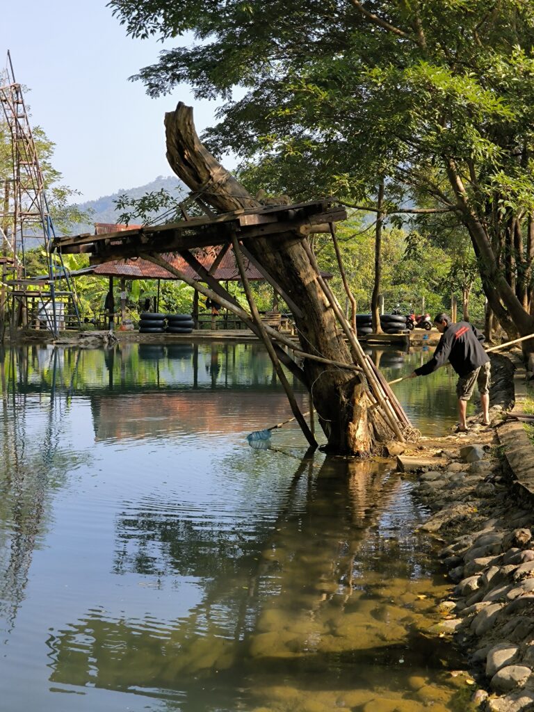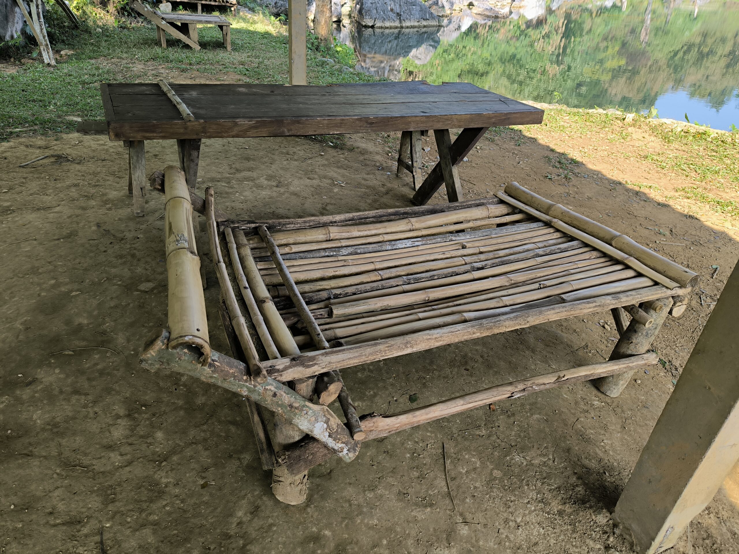 La France a Gustave et les laotiens…. Ben, ils ont personne. Donc forcément quand on doit organiser des rénovations ou des aménagements pour les touristes c’est à chacun de faire à sa guise. Prenons par exemple Van ( nom populaire laotien le vrai nom du paysan en question a été changé pour assurer son anonymat). Donc ce charmant cultivateur doit aménager le bord de son lagoon frequenté par plusieurs millier de touristes par année. Il va de soit qu’il a besoin de quelques chaises de plage , d’une ou deux tables de picnic ou encore d’un plongeoir pour amuser ces touristes. Notre brave Van pourrait investir quelque kips et récupérer le tout dans un centre de jardinage du village, mais malheureusement pour lui, il n’y a pas de centre de jardinage au Laos. Comme les Laotiens sont très débrouillards Van se met au travail…. Quelques minutes plus tard il a terminé son travail… Quelle rapidité me direz-vous… Et la qualité dans tout cela?