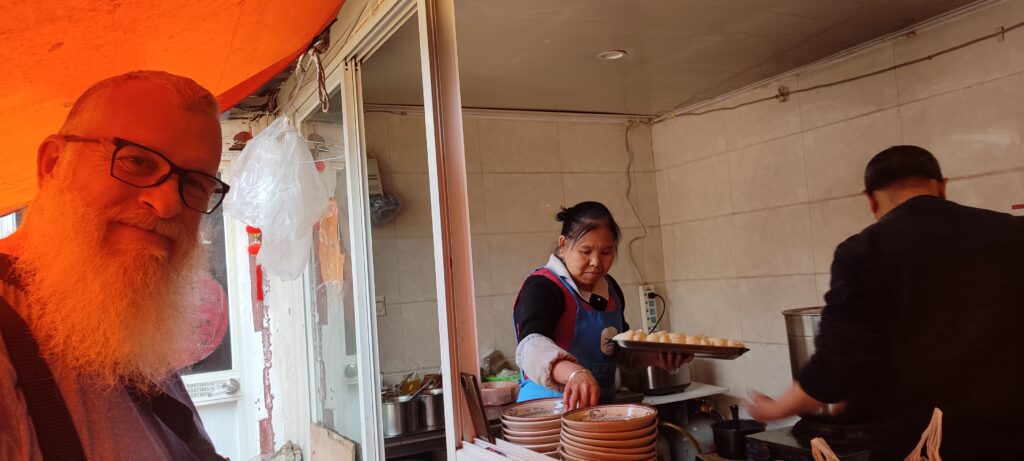 Même chose pour manger. Nous fonctionnons en montrant les plats déjà servis sur les tables pour indiquer que nous souhaitons la même chose ou bien une photo des assiettes qui sont affichées sur les murs. Si la serveuse est gênée, au lieu de nous laisser en plan elle va chercher de l’aide auprès de quelqu’un qui parle éventuellement anglais, souvent un client. Les chinois semblent heureux de nous assister jusqu’à présent.