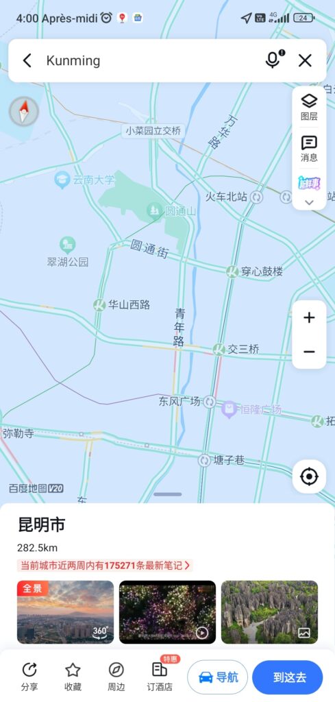 Hugo réussit à nous télécharger l’application locale qui équivaut à Maps. Par contre impossible de l’avoir en anglais, nous avons donc le plan avec tous les noms de rues en écriture chinoise. Il faut deviner les sigles qui veulent dire « Métro » ou « Gare ferroviaire » et surtout, essayer de se repérer avec ce que nous pouvons. Par exemple au centre de Kunming il y a un canal, nous le prenons comme point de repère et ensuite nous référons aux points cardinaux. Cela ne nous empêche pas d’avoir un peu de mal à retrouver l’hôtel en fin de journée. Mais tout comme à notre arrivée, nous n’hésitons pas à demander l’aide des gens dans la rue. Et les chinois sont très aidants et prennent le temps de trouver ce que nous cherchons et de nous donner les bonnes indications.