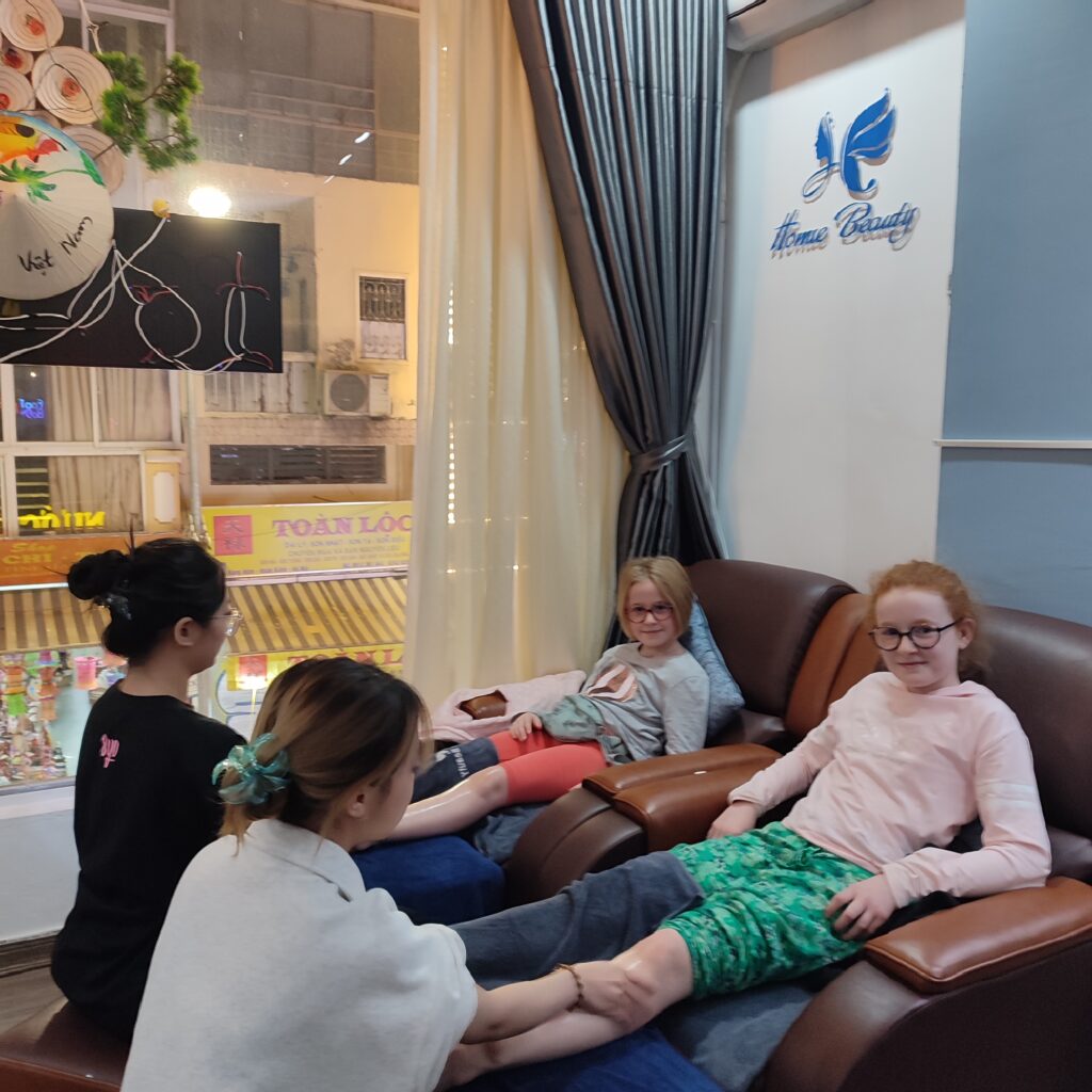 Hier on a introduit les filles au « foot massage ». Donc on se trouve un endroit à massage. « Hello, massage, Come, Come very good massage » . Bon, si elle le dit ça devrait être vrai . Alex négocie une réduction pour les filles de 25% sous prétexte qu’ elles ont des petits pieds… Bravo Alex… Donc on passe à l’ étage pour le massage. Alex et moi on se sent un peu mal , car la dernière douche date de Landas!!!! donc on sent « possiblement » un peu moins frais des pieds. Qu’à cela ne tienne, on s’assoit dans les gros fauteuils. Quatre jeunes filles prennent place et débutent par nous laver les pieds avec des lingettes pour bébés. Les femmes ne disent trop rien à nettoyer les pieds des trois filles, mais la mienne (la fille qui m’est attitré, était arrivée un peu plus tard) débute et ne semble pas heureuse d’être arrivée en retard, on pouvait clairement lire sur son visage qu’elle était la grande perdante. Comme les membres d’une mission suicide qui vient de perdre à la courte paille. Après quelques lingettes, elle arrête, montre à son patron qui passait une grande peau morte sous ma plante de pied (ancienne cloque, qui avait séché) et commence à parler rapidement.. pho fo fa (vietnamien pour bla-bla-bla) … more cash … Pho fo fa … Le patron me regarde , je prends la peau entre mes deux doigts et vlam je l’arrache… Un peu surpris le patron me regarde… Pho fo ta… only dead skin… La fille soupire et je reçois mon massage. |