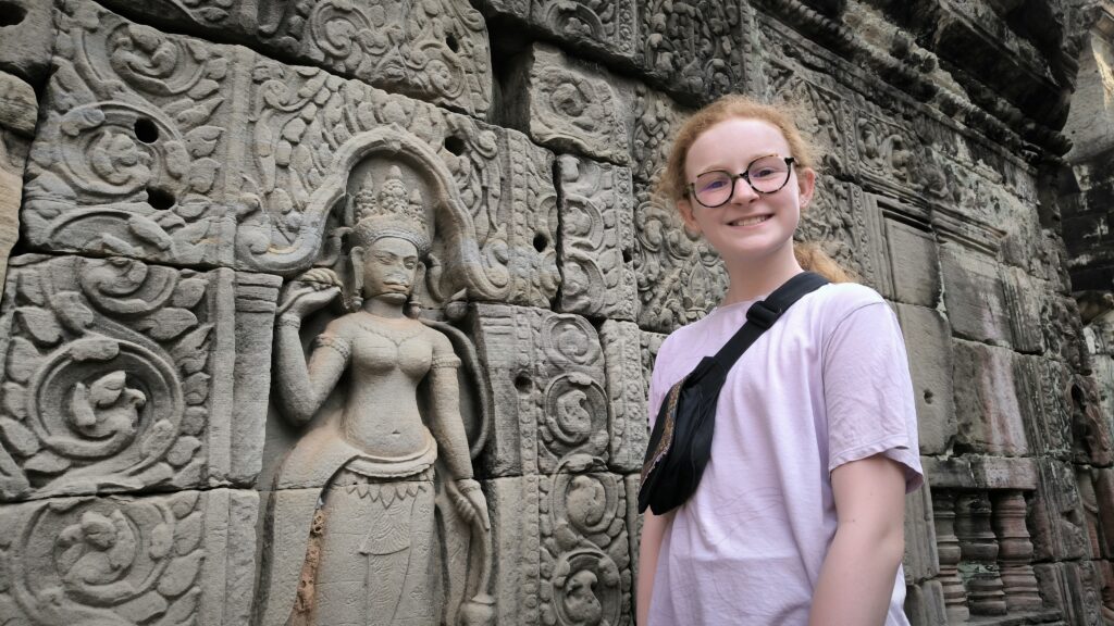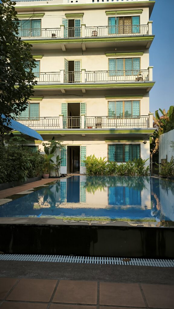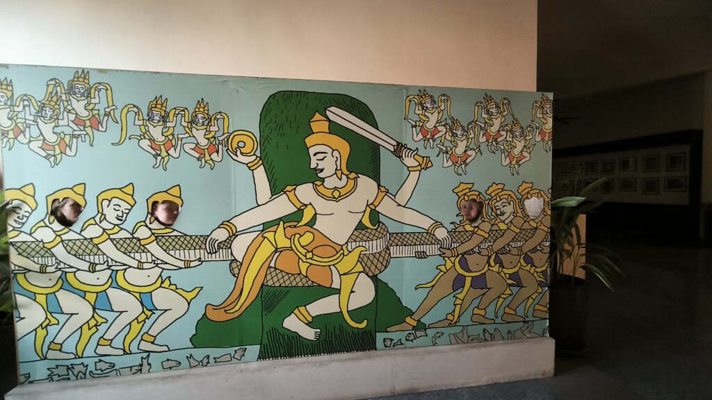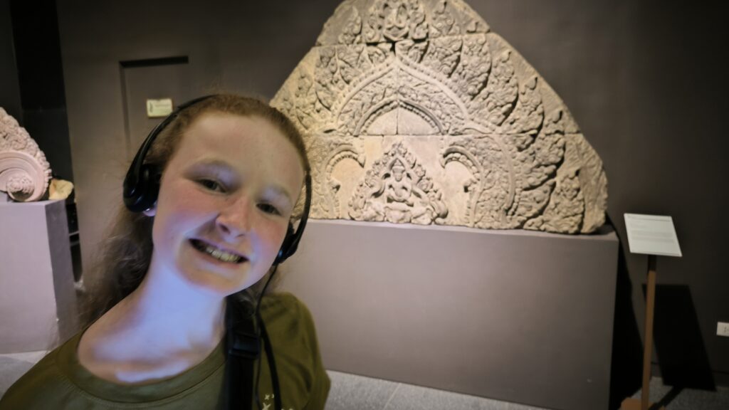 Nous trouvons notre guesthouse sur la rive opposée au marché. Les responsables de la guest sont charmants mais vue l’heure c’est impossible de prendre possession de nos chambres. Heureusement la guest a piscine et restaurant. Nous nous installons près de la piscine et attentons que nos chambres se libèrent. Vers 13h les chambres sont dispo nous pouvons enfin y déposer nos sacs et nous reposer un peu. En route vers les chambres le responsable nous montre une chambre familiale » free clim , for you. Or keep your 2 rooms » nous dit-il . Nous décidons pour les chambres séparées (après deux semaines de chambre familiale Alex et moi sommes heureux d’avoir un peu d’intimité): deux petites chambres l’une en face de l’autre avec ventilateur. En aprem nous prenons un tuk tuk pour nous rendre au Musée National d’Angkor, incontournable avant la visite des temples prévue de lendemain. Cela nous permet de nous familiariser avec les temples Khmer de la région de Siem Reap. Nous verrons l’importance de la religion Hindouiste dans les premiers empires Khmer et leur bascule vers le Bouddhisme en fin de l’empire Khmer. La succession des rois bâtisseurs entre le Xieme et le XIIIieme siècle sur le site d’Angkor.