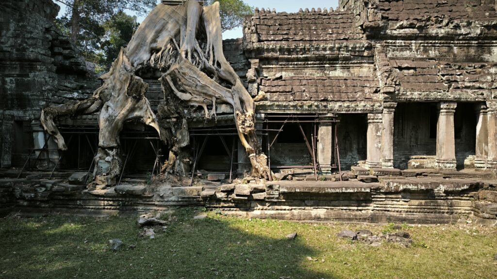 Le lendemain armés de nos connaissances nous partons à la découverte des temples. Les visites sont généralement organisées en deux itinéraires. Le grand circuit et le petit circuit. Notre chauffeur nous propose de faire le grand, car nous voulons associer la petite boucle au lever de soleil sur le temple d’Angkor Wat. Donc nous voilà en route vers Preah khan, pour moi (mais je crois pour tous) c’est le deuxième plus beau temple à voir . Les ruines restent assez intactes et on réussit assez bien à s’imaginer l’énorme espace utilisé par ce templ . Les murs conservent beaucoup de leur décoration.