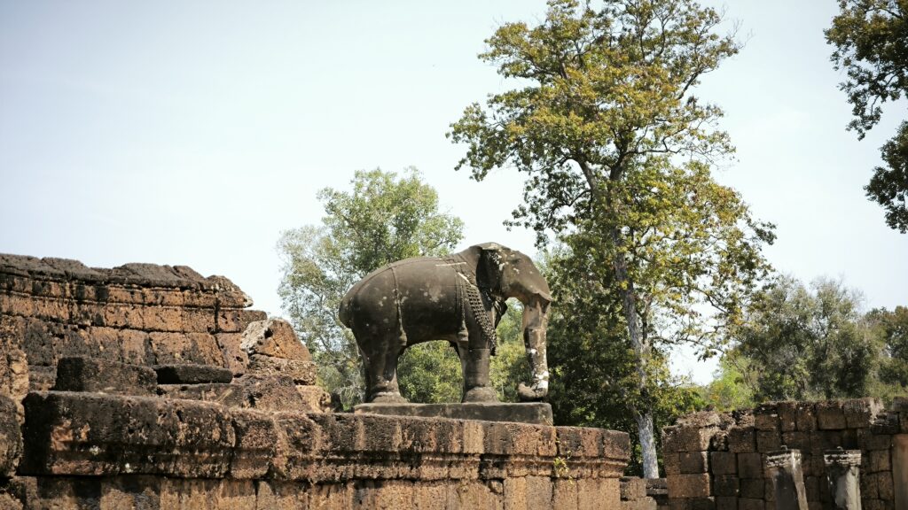 L’énergie de l’équipe commence à décliner. Courageusement nous terminons la journée par Mebon un grand temple similaire en architecture à Angkor Wat . Cinq tours, une à chaque point cardinal et une au centre. De grands éléphants montent la garde à chaque extrémités.